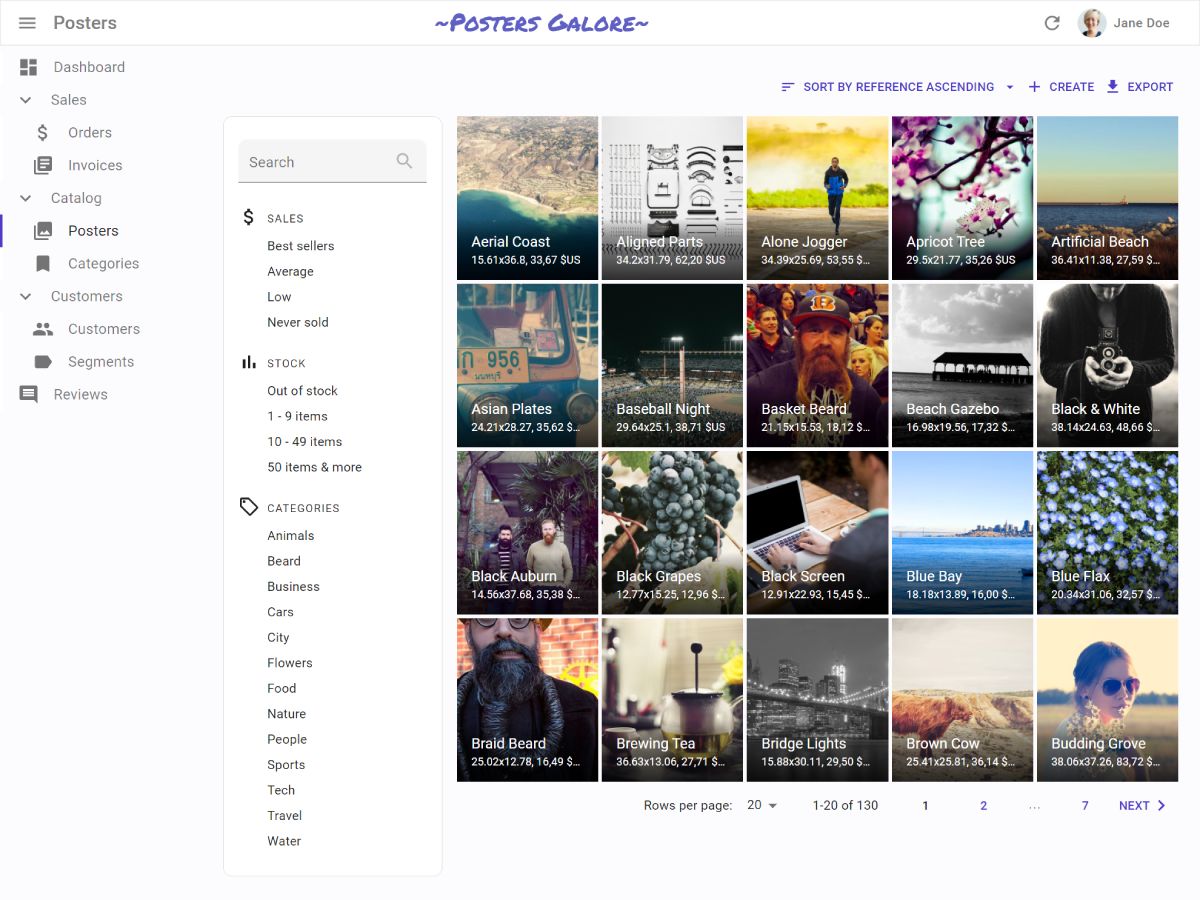 The admin of an imaginary poster shop, used as a demo for the react-admin framework. Uses many material-ui components, including tables, forms, snackbars, buttons, and theming. The UI is responsive. The code is open-source!